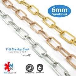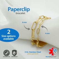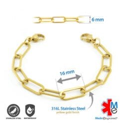 Our medical ID products are available in many metal finish options – (plain Stainless Steel, Rose Gold, Yellow Gold, or Black finish). The base metal in our medical bracelets is 316L Surgical Stainless Steel which is extremely durable, hypoallergenic, and can be worn in the pool or shower and will not tarnish.