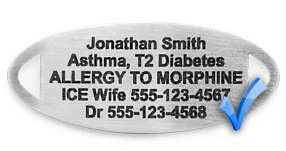 • We will always maximize and ENLARGE the engraved text by increasing the text size to the edges of the medical ID tag to maximize visibility for first responders.