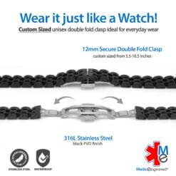 Our medical ID products are available in many metal finish options – (plain Stainless Steel, Rose Gold, Yellow Gold, or Black finish). The base metal in our medical bracelets is 316L Surgical Stainless Steel which is extremely durable, hypoallergenic, and can be worn in the pool or shower and will not tarnish.