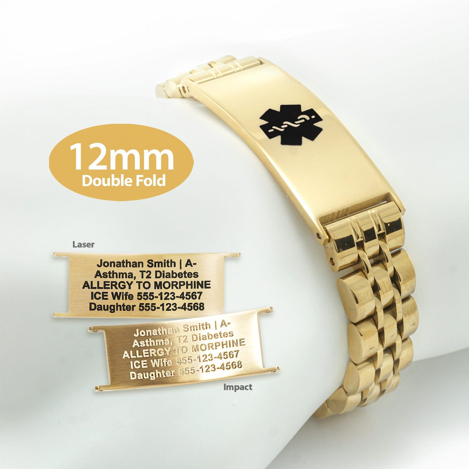 • We will always maximize and ENLARGE the engraved text by increasing the text size to the edges of the medical ID tag to maximize visibility for first responders.