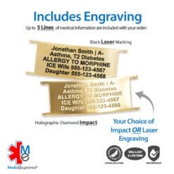 Never compromise on style or safety again! Our medical ID products are designed to provide peace of mind with elegance. Your custom engraved vital medical information is included in every product, ensuring first responders have the critical details they need to provide the best possible care in an emergency.