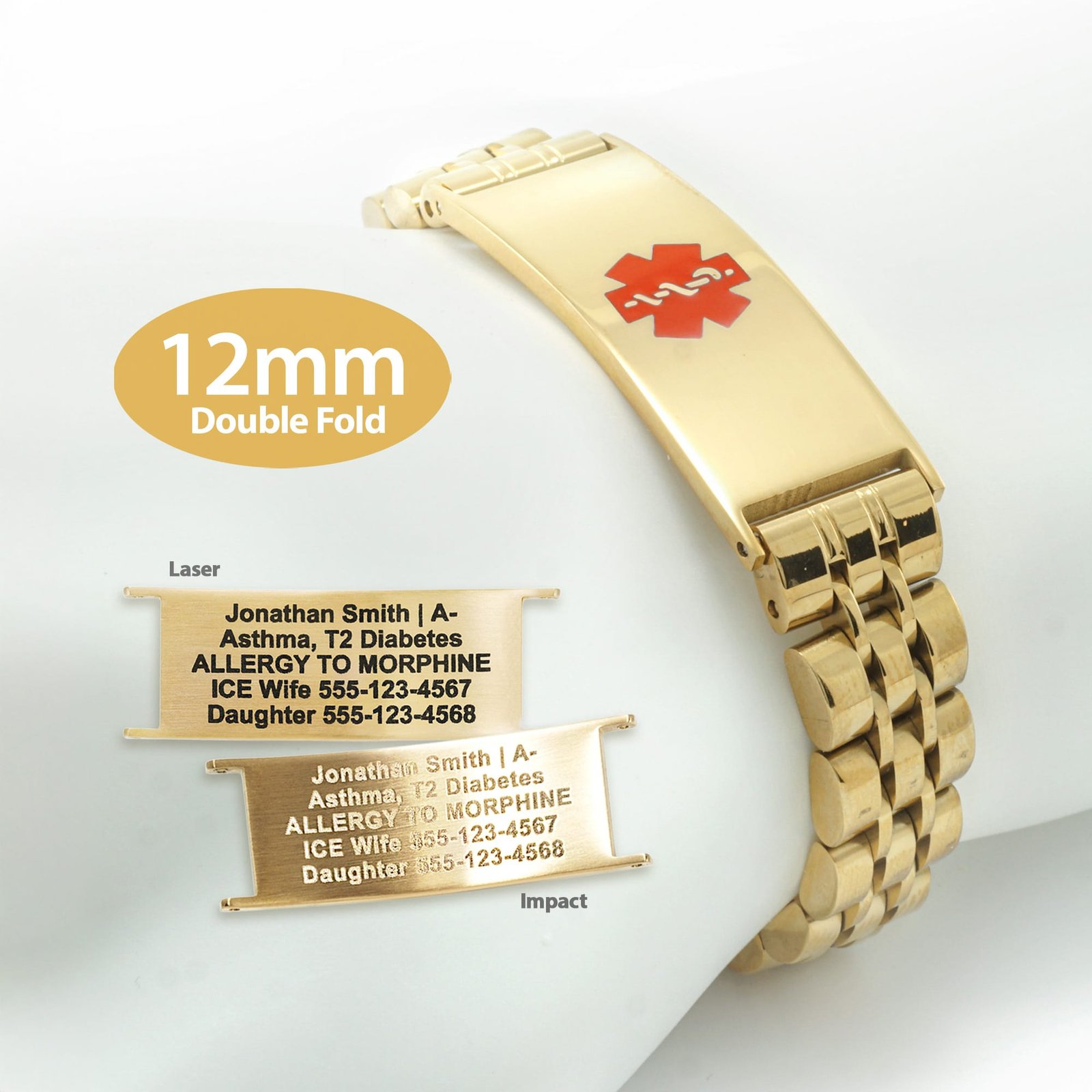 • We will always maximize and ENLARGE the engraved text by increasing the text size to the edges of the medical ID tag to maximize visibility for first responders.