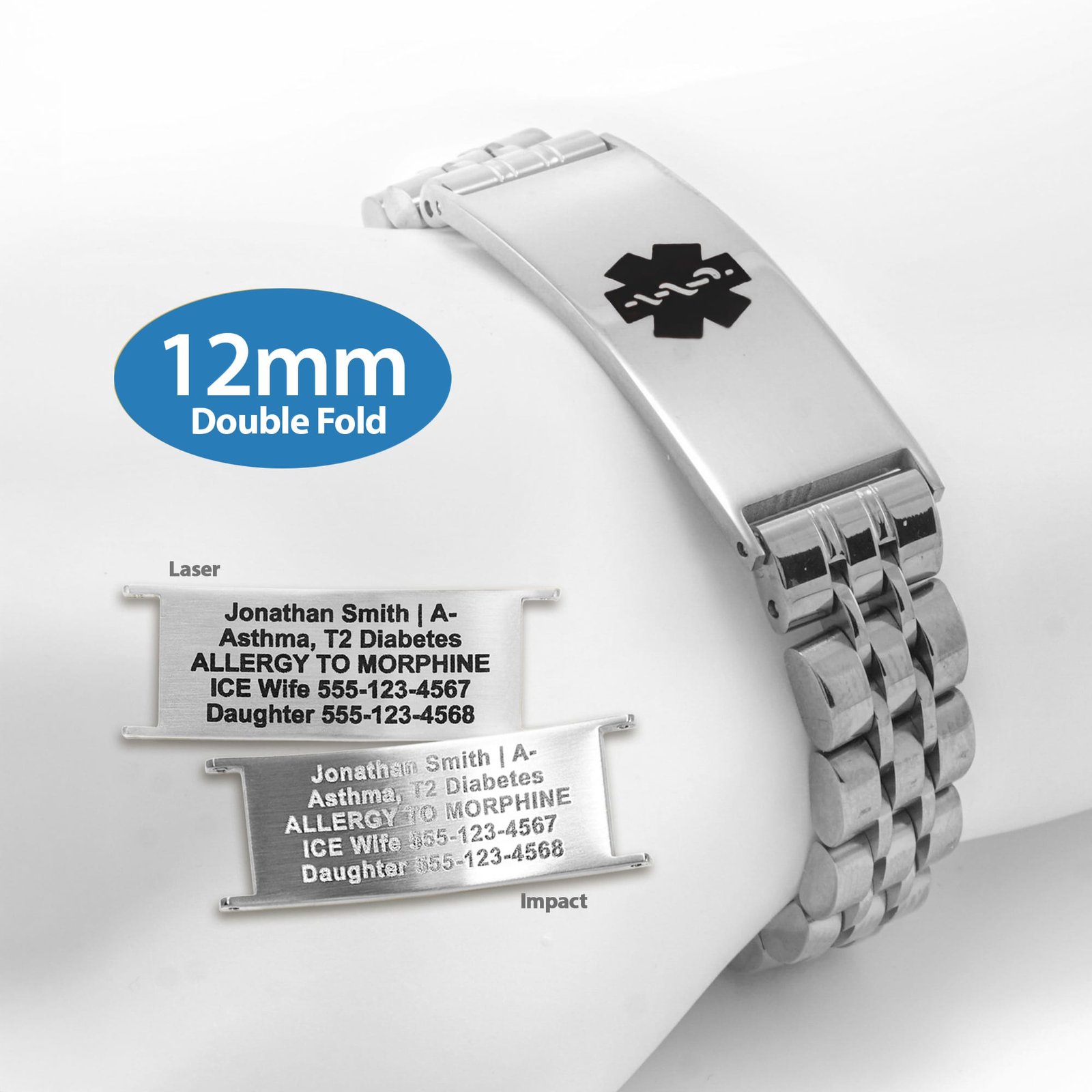Bracelet and Tag: Engraved with your vital medical info Metal: Hypoallergenic 316L Stainless Steel for lasting wear and comfort Clear Engraving: Choice of Holographic Diamond Impact or Black Laser Marking Multiple Sizes: Made to order, based on snug wrist size Bonus Wallet Card: Included for expanded medical info for added security Protection: Includes a luxurious felt pouch for safekeeping your bracelet