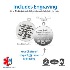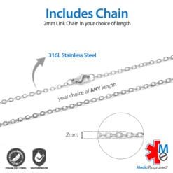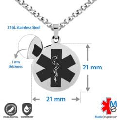 A great alternative to medical bracelets. Forgetting to put on your bracelet or watch in the morning? A medical ID necklace may be the right fit for you! No need to remove it, you can simply wear it all the time. This circular shaped medical ID charm is made from 316L stainless steel with a black enameled medical symbol on the front, which serves to alert first responders to your medical information engraved on the back. Your choice of a 19 or 23 inch, 3mm curb necklace is included and is 100% 316L surgical stainless steel, which is hypoallergenic, so it can be worn by anybody!