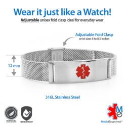 Fold Clasp Medical ID Mesh Band with Stainless Steel Finish – 12mm (MF12_SRD)