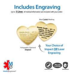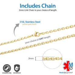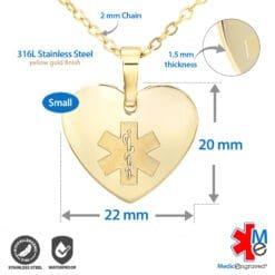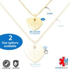 Forgetting to put on your bracelet or watch in the morning? A medical ID necklace may be the right fit for you! No need to remove it, you can simply wear it all the time. This heart shaped medical ID charm is made from 316L stainless steel in rose gold with a embossed medical symbol on the front, which serves to alert first responders to your medical information engraved on the back. A 2mm oval link chain is included and is 100% 316L surgical stainless steel in rose gold, which is hypoallergenic, so it can be worn by anybody!