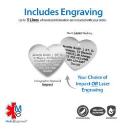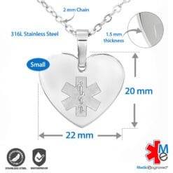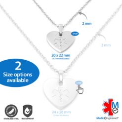 Forgetting to put on your bracelet or watch in the morning? A medical ID necklace may be the right fit for you! No need to remove it, you can simply wear it all the time. This heart shaped medical ID charm is made from 316L stainless steel in rose gold with a embossed medical symbol on the front, which serves to alert first responders to your medical information engraved on the back. A 2mm oval link chain is included and is 100% 316L surgical stainless steel in rose gold, which is hypoallergenic, so it can be worn by anybody!