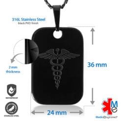 Forgetting to put on your bracelet or watch in the morning? A medical ID necklace may be the right fit for you! No need to remove it, you can simply wear it all the time. This rectangle shaped medical ID charm is a made from 316L stainless steel with an embossed medical symbol on the front, which serves to alert first responders to your medical information engraved on the back. Your choice of a 19 or 23 inch, 3mm curb necklace is included and is 100% 316L surgical stainless steel, which is hypoallergenic, so it can be worn by anybody!