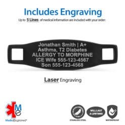 Our bracelets are fully customizable, allowing you to engrave any information you deem important for first responders or medical professionals to know about in an emergency. This may include: • Your name • Medical conditions • Allergies • Medications • Emergency contact information • Or absolutely anything!