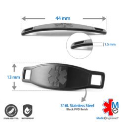 Our medical ID products are available in many metal finish options – (plain Stainless Steel, Rose Gold, Yellow Gold, or Black finish). The base metal in our medical bracelets is 316L Surgical Stainless Steel which is extremely durable, hypoallergenic, and can be worn in the pool or shower and will not tarnish.