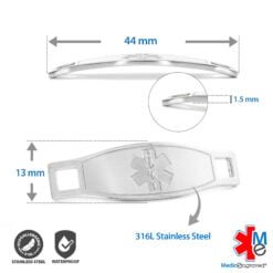 Our medical ID products are available in many metal finish options – (plain Stainless Steel, Rose Gold, Yellow Gold, or Black finish). The base metal in our medical bracelets is 316L Surgical Stainless Steel which is extremely durable, hypoallergenic, and can be worn in the pool or shower and will not tarnish.