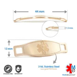 • The rose gold / yellow gold / black finish is applied through PVD – an industry standard used by well known watch brands like Rolex and Cartier. PVD coatings are more brilliant and resistant to corrosion from sweat and regular wear than regular gold plating. It’s an ideal choice for medical ID jewelry and for people who never take their jewelry off, as it is extremely vibrant and durable for many years. (we have yet to have customers reporting any fading issues to us!)