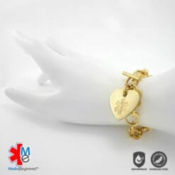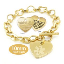 Heart Link 10mm Toggle Bracelet in 316L Stainless Steel Yellow Gold Finish with 24x26mm Heart Medical ID Charm (THT10-GEM)