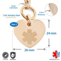 • The rose gold / yellow gold / black finish is applied through PVD – an industry standard used by well known watch brands like Rolex and Cartier. PVD coatings are more brilliant and resistant to corrosion from sweat and regular wear than regular gold plating. It’s an ideal choice for medical ID jewelry and for people who never take their jewelry off, as it is extremely vibrant and durable for many years. (we have yet to have customers reporting any fading issues to us!)